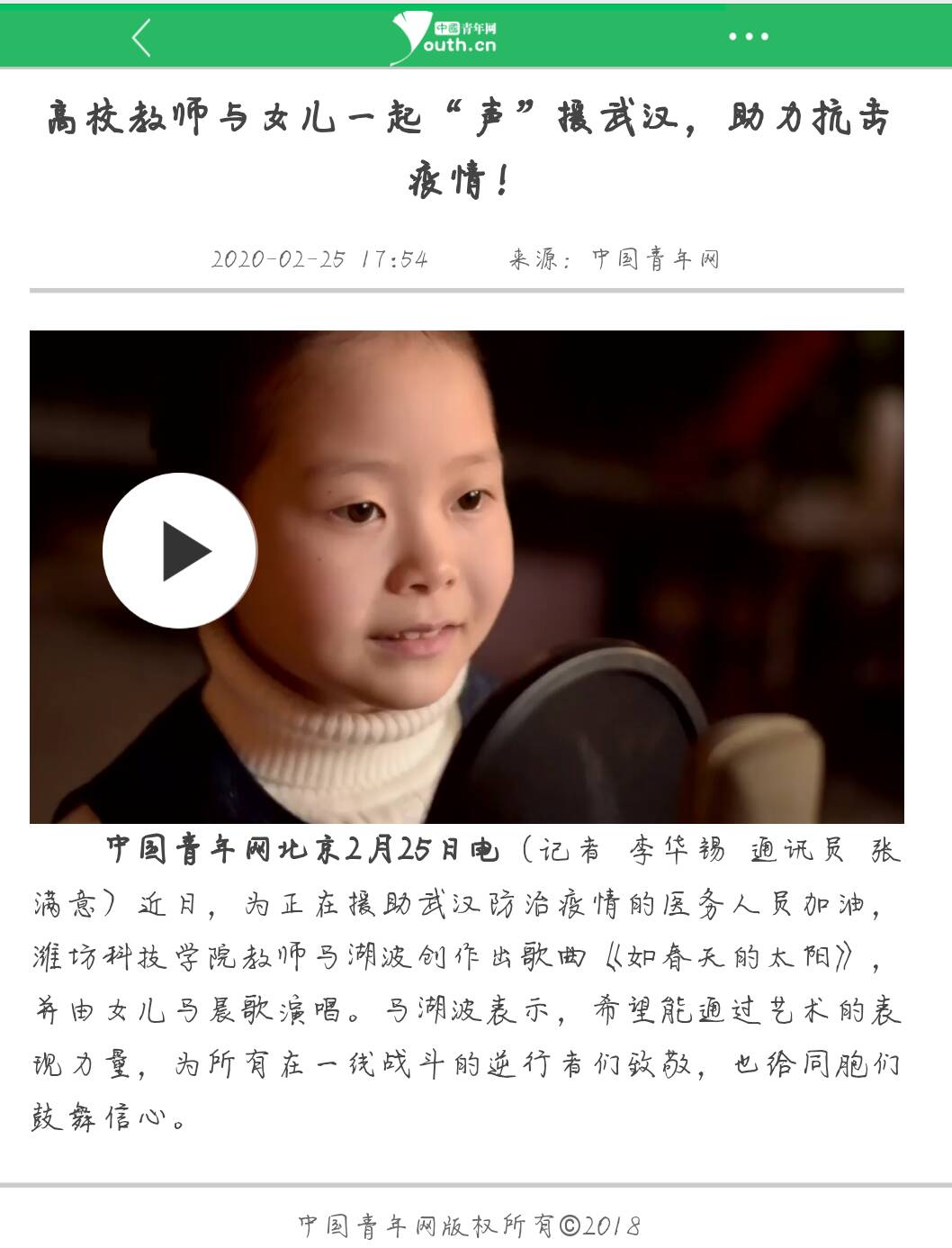 抗疫一线,白衣英雄们不舍昼夜;坚守后方,声音从四面八方涌来。身为党的教育事业的一份子,一名教师,更是一名员工导师的马湖波老师在疫情期间创作了一首《如春天的太阳》,以一首歌的铿锵力量致敬最美逆行者,并得到了中青网的转发支持。