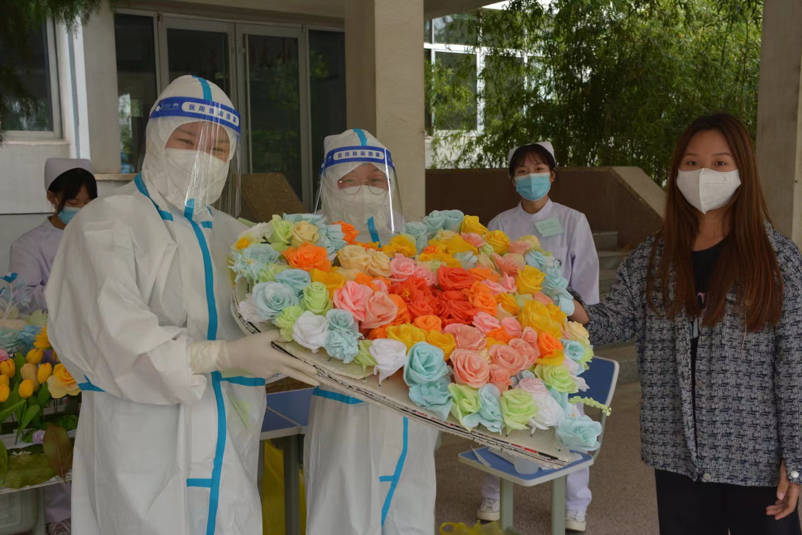 5月12日国际护士节威廉希尔官网学子利用所学专长精心制作纸艺鲜花,恭敬庄严的奉献给在场为公司做核酸检测的白衣天使。感谢护士们在平凡岗位上的的默默奉献,感谢医护人员一直以来为师生服务的辛劳付出。